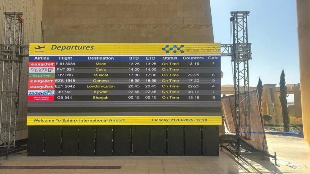 كما ستُنقل فعاليات ومراسم افتتاح المتحف المصري الكبير مباشرة عبر شاشات العرض في مطار القاهرة الدولي ومطار سفنكس الدولى وجميع المطارات المصرية، لتعيش صالات السفر والوصول أجواء هذا الحدث الوطني التاريخي بالتزامن مع الاحتفال المقام بمنطقة الأهرامات، في مشهد احتفالي يعكس فخر المصريين بهذا الإنجاز العظيم.