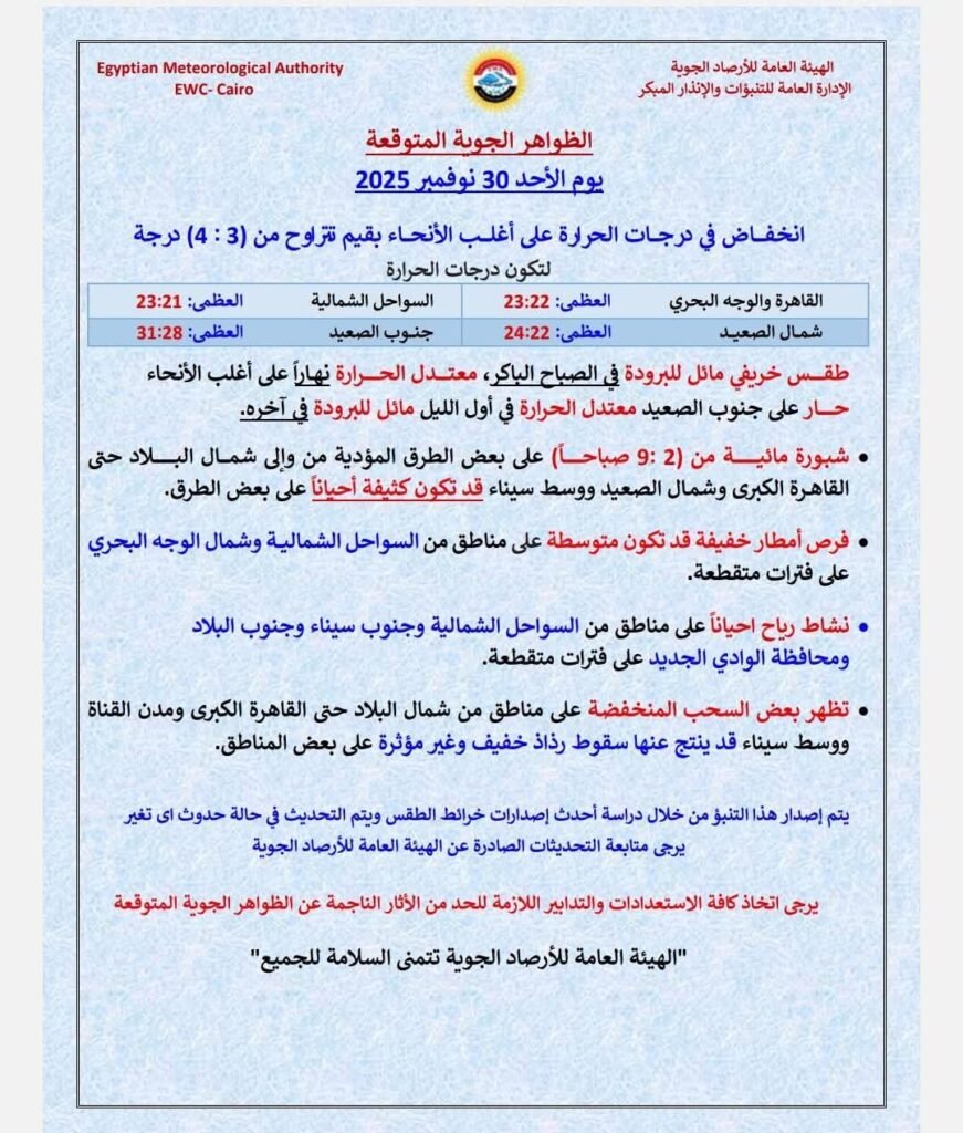 اليكم بيان هيئة الأرصاد الجوية يوضح حالة الطقس اليوم